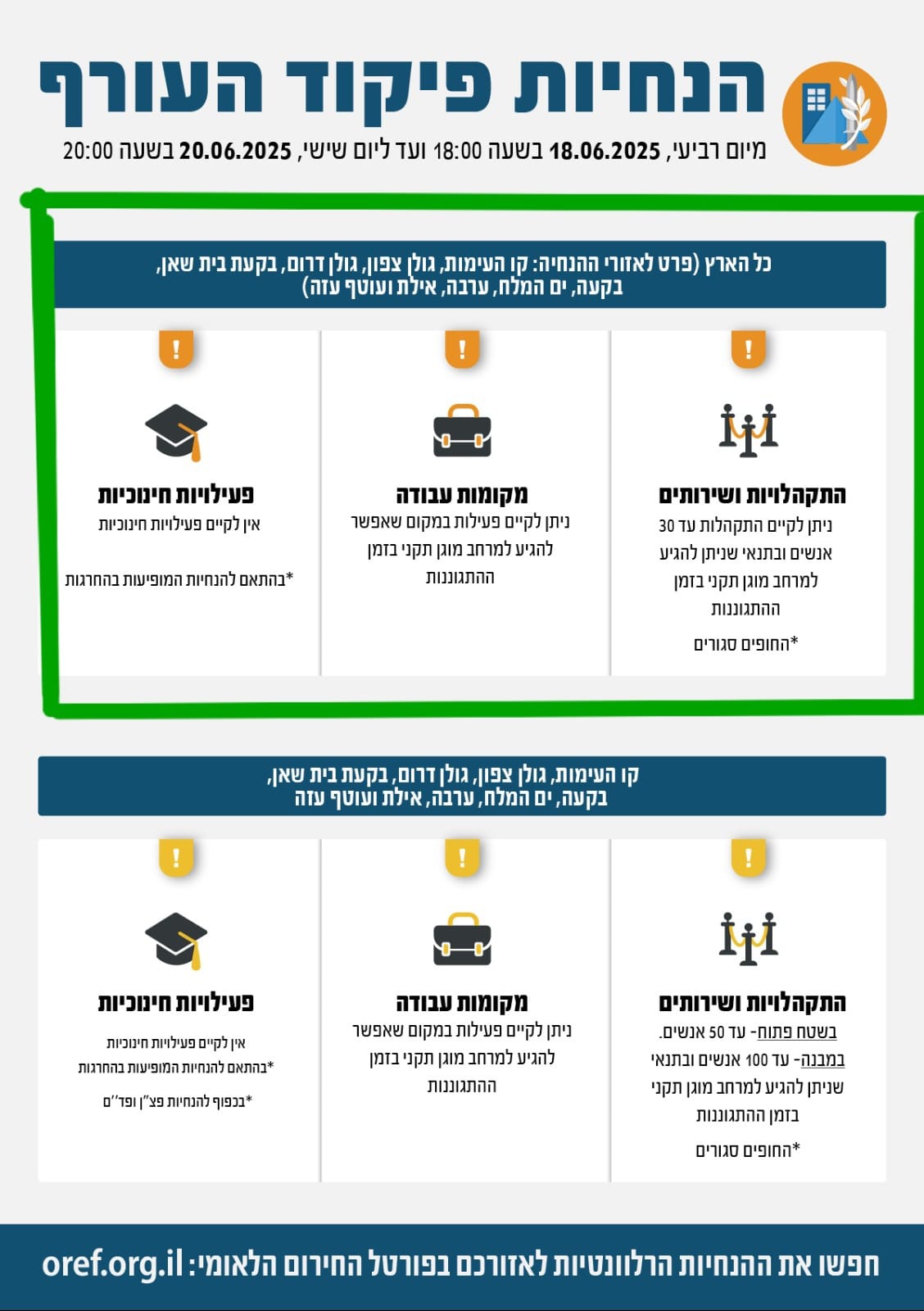 מצורף מסמך מדיניות ההתגוננות מיום רביעי, 18 ביוני 2025, בשעה 18:00 ועד ליום שישי, 20 ביוני 2025, בשעה 20:00.